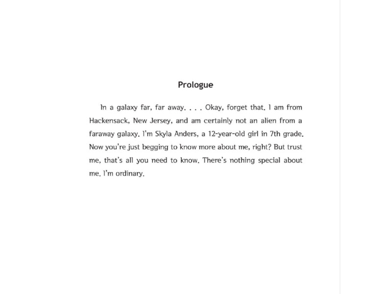 Summary: Skyla Anders believes she is just a typical 7th grader in New Jersey until the day she is one of a dozen kids who find themselves transported into space and tasked with an impossible mission of cosmic proportions. In her search for a mysterious device that may save the world and history as we know it, Skyla must also look inward to discover her own power and the truth about her past.